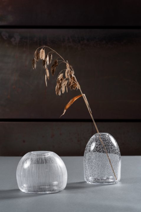 Med hjärtat i det blåsta glaset vare sig det gäller kärlformer eller planglas leker jag med det dekorativa. Jag bränner in dekaler och förspeglar för att skapa djup och mystik eller låter blåsta delar täcka ytor. I bruksgodset vill jag locka fram det sensuella och låta färgen skimra. Jag har blåst glas sedan 1974.